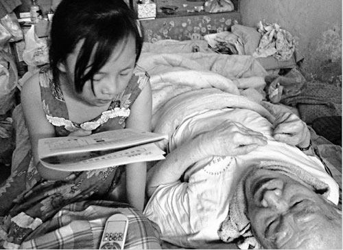 顺着读书声,记者走进小雅慧家,看到了这个扎着马尾辫、瓜子脸,穿一条褪色红裙的小姑娘。她一手拿书,一手为姥爷扇扇子,嘴里还抑扬顿挫地念着。小雅慧说,这是第110次给姥爷念课文《阳光》了。念完后,她就跑到厨房,洗菜,烧水,给妈妈做饭。