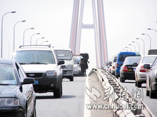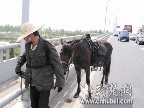 头顶草帽、肩挎背包,一身厚厚的休闲服,跨下威武的枣红马。昨日下午,武汉三环线长江三桥桥面出现的这名骑士令过往车辆惊愕让路,交警紧急赶到极力劝阻后将游侠护送离开城市快速路面。