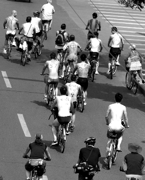 着泳裤、泳装,身上画着五彩花纹,骑着自行车,昨天(4日)下午,约有20位网友如此装扮出现在北京的街头。据活动的组织者介绍,该活动意图在于倡导让人们选择方便、环保的自行车出行,“裸露”的人体则是提醒司机要注意骑车人的安全。