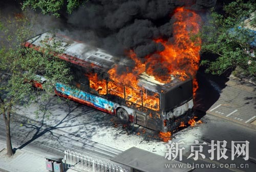 7月6日上午8时30分许,华威桥南50米处,一辆公交车突发大火。 读者赵先生摄 图片来源:新京报网