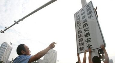 昨日,石市交管局设施大队在建设大街裕华路口安装了四块“严禁施舍”警示牌。设施大队彭连升表示,乞讨人员严重干扰了交通安全,交警曾将一些乞讨人员送到救助站,但乞讨人员并不愿意留在那里。无奈之下,交警挂出警示牌提醒司机注意安全。
