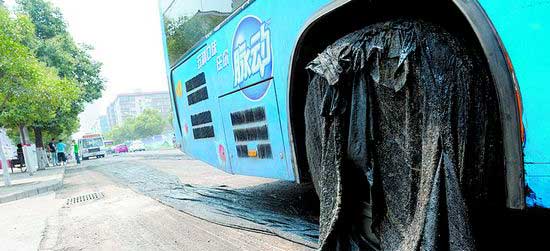 天太热,把路上的沥青全都晒化了,车从这里通行时,车轮粘上晒化的沥青,沥青再粘着下面的“石布”,撕裂后全卷到车轮里,全都跑不动了。