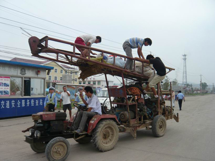 7月2日,(安徽)淮南交警大通大队上窑中队在辖区内,开展打击机动车故意遮挡污损号牌、未按规定安装机动车号牌、未悬挂机动车号牌等涉牌涉证违法行为的行动。10点多,正在服务站执勤的民警发现,一辆貌似“卧铺”车的拖拉机“一蹦三跳”地由东向西行驶而来。此拖拉机经过改装的车斗子共分3层,并且每一层的空间都很宽敞,下面一、二层“卧铺”放有施工工具,最上面一层“卧铺”留人睡觉。拖拉机一开,三层“卧铺”就不由自主地晃悠起来。让人更为担心的是,最上面一层“卧铺”真有不少人在睡觉。民警发现此情况后,当即将其拦下,当民警向驾驶员询问该车后的车斗缘何如此时,驾驶员还沾沾自喜地说这是自己的小“发明”,既节省了坐车的车票钱,又可以带上不少施工工具,真是一举两得!