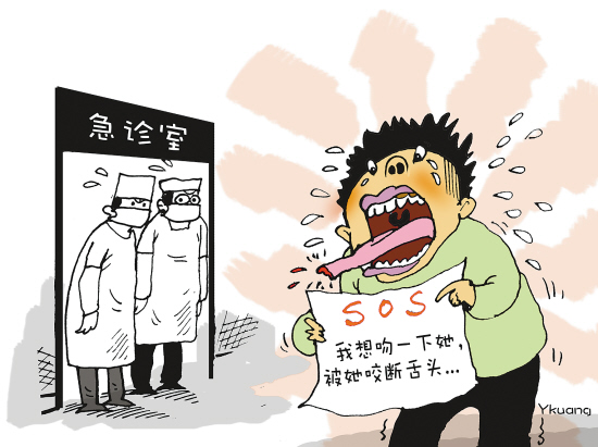 本月3日晚上,广州某公司组织员工到湛江旅游,在湛江市赤坎某酒店联欢,28岁的员工钟平(化名)喝多了酒,醉吻同公司的女孩子晓盈(化名),谁知竟被晓盈咬掉了半手指长的舌头。钟平被朋友紧急送到湛江中心人民医院救治。事发后,警方已介入调查。