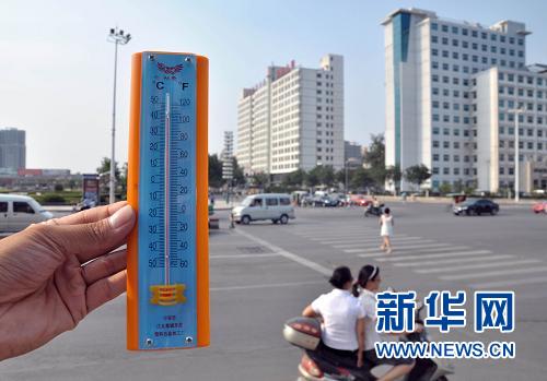 温“烤”验下的生活。7月6日16点53分,山西省运城市街头一位市民手中的温度计显示当时气温突破40摄氏度。 新华社发(黄文鹏 摄)