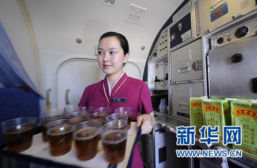 7月6日中午,南方航空公司一位乘务员准备向机上旅客发放凉茶。为应对持续的高温天气,南航近期开始增加机上消暑饮品的供应量,其中凉茶占到机上饮品的4成以上,比平时增加了一倍。新华社发(徐勤涛 摄)