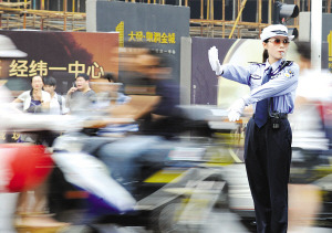 美丽女交警站在街头指挥交通。范晓林 季宇轩 摄