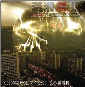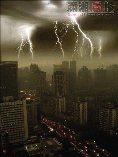 昨日下午2时,一阵电闪雷鸣后,长沙的天空顿时暗了下来,倾盆大雨持续了一个多小时。随后一张带有“2010年7月9日下午2:40长沙芙蓉路”字样的图片在贴吧里和各个QQ聊天群疯狂转载。