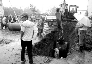 此处地铁施工单位中铁一局工作人员称,前日下午天降暴雨,导致该路口积水,随后工人发现地铁站底层有大量积水。他们通知相关部门,并决定于昨日早上进行整修。“还没修,路就塌陷了。”该工作人员称,昨日早上4点40分,地面塌陷。随后,塌陷处燃气管道断裂。燃气公司将阀门关闭。