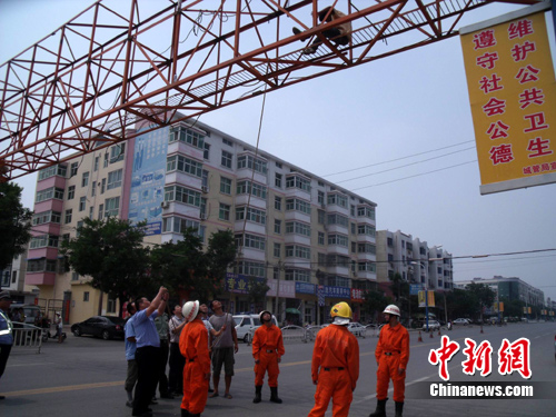 7月12日中午12时20分,河南焦作市武陟县新汽车站附近广告架上一名十六七岁少年因向父母要钱未果,欲跳下自杀。经过当地消防官兵和民警一致努力,终将少年成功救下。