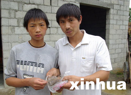 丁飞(右)上山采药,儿子一同前往。图为父子俩一起展示他们发现的奇异毛发。(来源:新华网湖北频道)
