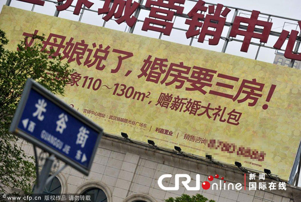 资料图片:武汉光谷一楼盘在一块巨幅户外广告上,打出“丈母娘说了,婚房要三房!”的广告语,被指是在贬低武汉人的形象。