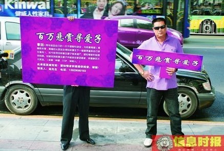 昨天的广州一如前几天般炎热。在近40℃的高温下,一个40多岁的男子出现在广州闹市区的街头,举着一块牌子,声称要悬赏100万寻找自己从未谋面的儿子。按照该男子的说法,他是武汉的一个房地产商,两年多前和前妻离婚,当时不知道对方已有身孕。最近偶然得知前妻在广州,自己的儿子已有两岁多了。于是来到广州,希望能找到母子俩。