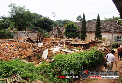 湘潭县石潭镇被洪水完全冲垮的一栋房屋。李志宏摄
