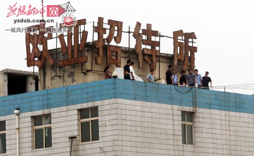 7月14日上午8时50分,本报接到读者爆料称,省会桥西蔬菜批发市场内的欧亚招待所楼顶有一家三口人要集体跳楼,有好多群众围观,已报警,警察正在楼顶营救劝说。