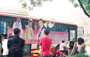 昨日上午10点半,细雨濛濛。南京鼓楼广场上,一辆74路公交车围着广场慢悠悠地绕圈。就在过往路人纳闷之际,转过来的车身解开了谜底,原来是一名亿万富豪搞的征婚秀。只见面向慢车道的车身上,醒目地贴着大幅彩色喷绘写真横幅,从左到右依次是白素贞、七仙女、祝英台的人物剧照。车身上密密麻麻的,是这名富豪的爱情书:一定要找一名集上述三女子优点于一身的人为妻。