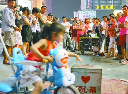 “我要给这个姐姐捐钱。”“妈妈我想向她献爱心”……经常,来纳凉闲逛的游客和本地市民,会主动向“爱心箱”里投放各种面值的钱币,其中小娃娃们是主力,其实孩子们也是受到家长鼓励跑上前去的。一些外国游客也会掏出百元大票表示赞赏和“襄助”。