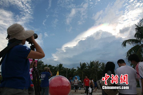 7月18日下午17时,海口假日海滩西侧上空出现七彩云,奇观持续时间约一个小时,引起市民驻足观看。