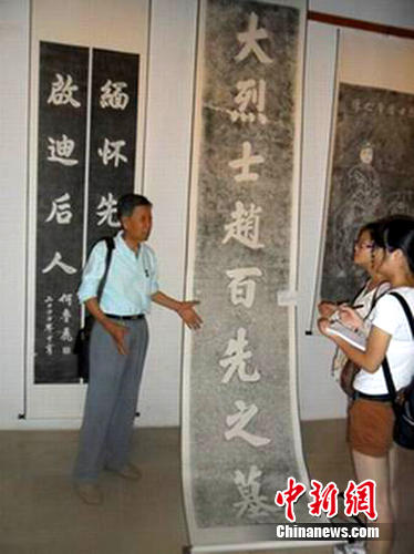 2000年前,从镇江搪瓷厂工人退休的窦启荣,一次在建筑工地废墟里看到散落在那里一块被糟蹋的古石碑,感到痛心可惜,便萌生出寻找收集镇江各地古石刻,传播历史文化的思想。十多年来,他或步行,或骑自行车,走遍了镇江名山、名寺和众多村、巷,寻找古石刻,吃尽了千辛万苦。记者从他碑拓展现场,看到了一幅幅精美动人的碑碣、匾额、砖铭、界碑、摩崖石刻、墓志铭等古石刻拓品,其翻拓的古石刻时间跨度前涉汉代,后至民国。每幅拓本上都夹有窦老对其方位,内容含义以及大小质地的详细解说卡片,让拓本都有自己的“身份证”,使参观者一目了然。据悉,这些石碑有的长年尘封在破烂的古庙里,有的淹没在沟河里,有的埋入在废弃的古井和厕所里,有的甚至被当做建筑石材所用。通过他亲手挖掘出来,真实记录了他寻找收集地下文化的动人业绩。