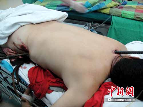 一根长超1米,直径为2.5厘米的钢筋从四川一男子的右腰穿进了体内,从身体左侧肩胛颈部穿出。刘波 摄