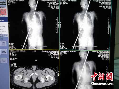 四川男子钢筋穿身而过的CT图。刘波 摄
