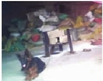 大狼狗守门,后面堆放的是黄豆。记者实地暗访后看到的情景。记者 李丹 摄(非正常拍摄)