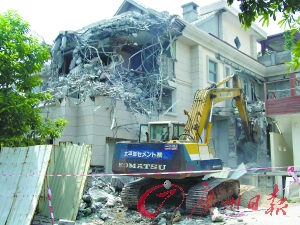 记者看到,经过两日的强拆,宏达径26号违建别墅面向小区的墙体已经全部拆除,别墅内部2层和3层楼板和隔墙也已支离破碎,别墅中部被拆出了一个大凹洞,大量钢筋和钢材悬露在外。