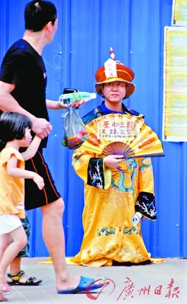 男儿膝下有黄金,下跪路人是为何?昨天,天河公园的门口人行道却有一位湖南籍男子身着宫廷皇袍,悠然自得地跪在马路边,他自称想用这种“义跪”的另类方式引起广州人关注,以推销他的公益网站。