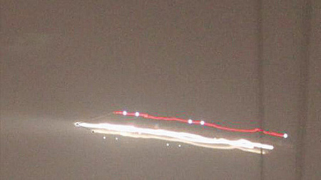 通过对照片的技术处理,隐约能从光源尾部复原出飞机尾部