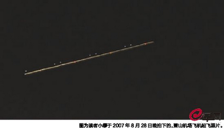 读者小缪于2007年8月28日晚拍下的萧山机场飞机起飞照片。