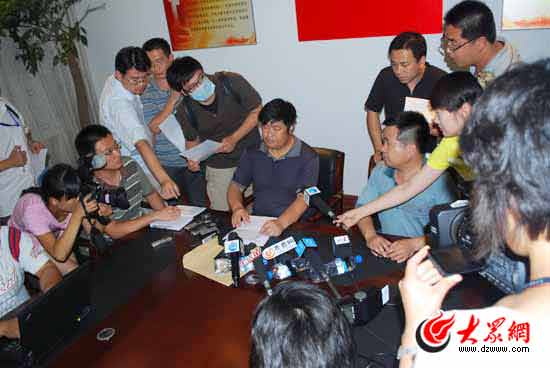 在新闻发布会现场,记者团团围住济南动物园党委书记刘俊刚