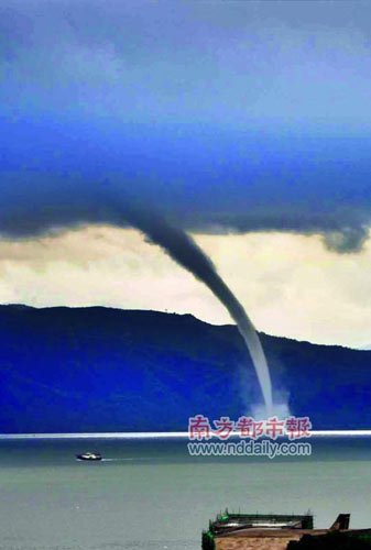 昨日上午8时50分至9时07分,深圳市深圳湾西南部海域上空,出现巨大的“水龙卷”(龙卷风漏斗伸到海边吸起水柱),这是深圳气象史上首次直接记录到龙卷风(如图)。当天香港后港湾海域也出现三条“水龙卷”。 读者汪江斌供图