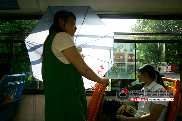 2公交车上,市民撑伞阻挡强烈的太阳。 图/潇湘晨报滚动新闻记者 华剑
