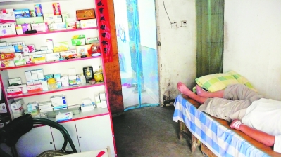 在新蚌埠路与凤台路交叉口西边城中村内,一个狭窄嘈杂的菜市场里,记者走进了一家名为“苏强诊所”的小门诊。只见两间大小约二十平米的平房里,一张桌子上摆放着一个小电视,桌子下面的一个大箱子里堆满了废弃的药盒、针管。再加上一架满放着药品的药柜、两条长椅和三张单人床,就是这间诊所的全部“家当”。