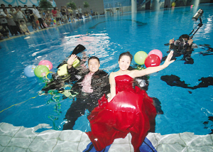 昨天上午十点,当记者走进南京奥体中心游泳馆内,只见馆内喜气洋洋,气球拱门、巨幅结婚照将游泳馆装扮成了婚礼殿堂。当新郎吴春朋和新娘唐梅,手牵着手站在10米跳台上时,游泳馆内发出了一声声惊叹,不少游泳的市民凑上来看热闹。