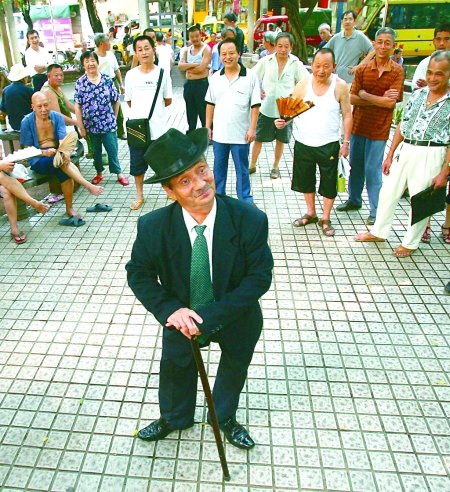 他拄着拐杖,脚成外八字,睁圆了眼睛,不断地动着嘴唇,时而将拐杖扛在肩上,嘟着嘴巴,做着一连串的搞怪动作,逗得市民捧腹大笑。因动作较大,他一踢腿,脚上的大皮鞋甩飞了,市民们更是笑弯了腰。
