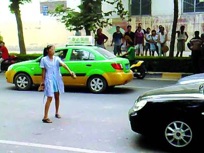 上午10时40分,女孩跑到一旁拿了路边的砖块,不停地往路中央扔,很多车见状不敢前行。后来她干脆拎着两块砖,堵住高档私家车。“被她闹得都堵车了,堵了100米,有五六分钟。”目击者姚先生说。一个婚礼车队被堵住,一女士下车和她理论,两人扭打在一起。姚先生说,女孩后来被两个男的推倒,可能是摔疼了,跪在地上不停地哭。11时,民警赶到后将其带走。