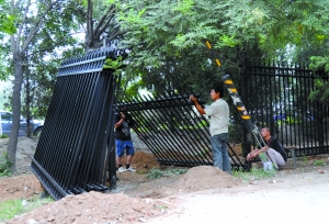 昨日,昌平区史各庄村,村口、沿街正在安装铁栅栏。记者 杨杰 摄