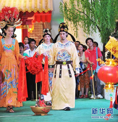 8月14日,在上海世博会陕西馆,几名外国游客在体验“大唐婚典”。当日,上海世博会陕西馆为迎接我国传统节日“七夕节”而举办的“华清池中华情人节系列活动”开幕。两对外国游客现场体验了“大唐婚典”,感受中国情人节的浪漫。新华社记者 丁海涛 摄