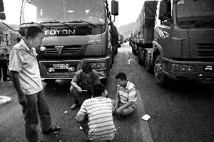 京藏高速内蒙古兴和至河北省怀安段堵车已达3天。昨日,一些司机席地而坐,边吃饭边等待路通。本报记者 王嘉宁 摄