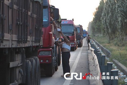 8月16日,京藏高速内蒙古兴和到河北段进京方向,商人向司机出售盒饭。(图片来源:国际在线)
