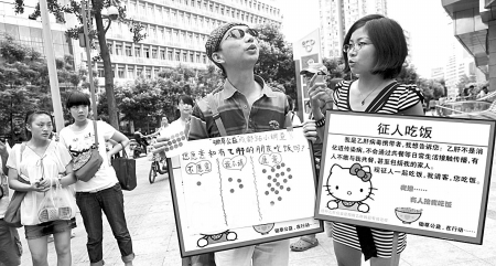天下真有免费的午餐,但并不是所有人都敢吃。昨日上午,在成都上东大街的繁华路段,一位女子高举木牌征人吃饭,宣称:我请客,您吃饭。即便如此,并不是所有人都愿意驻足,有的甚至仓皇而去。1小时的举牌时间内,有10人答应一起吃饭,最后只有8人赴约。