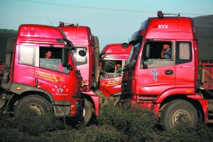 10点30分,记者驱车来到京藏高速张家口服务站1公里处,高速下的207国道被堵得严严实实,马路上三条道排满了运煤大货车,记者停车翻越护栏来到桥下,脚踩之处,灰尘厚约3厘米。“前面就是万全站,大货限制上京藏高速。”据一名冯师傅介绍,他的车上拉有39吨煤,19日从内蒙古东胜出发,经110国道,22日晚12时到达这条堵塞路段,“10多个小时,到现在也就前进了2公里。你往北走,后面堵了至少七八公里,后面还有更多煤车跟上来。”