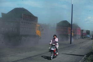 万全县境内的大货车掀起的灰尘令行人呼吸困难。