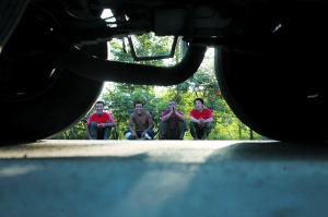 师傅持铁棒修理被撞车