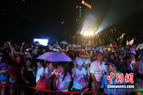 在开幕晚会上,原花儿乐队主唱大张伟的精彩演出更点燃了重庆市民的热情。现场随处可见被啤酒淋得全身湿透的市民,毫不在意地挥舞着手中的荧光棒与台上的歌手互动。