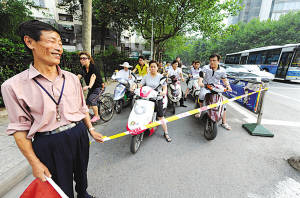 昨天下午5点左右正值下班高峰,在南京上海路和华侨路路口,汽车很多,骑车的人更多。记者发现三个路口慢车道上,协管员手里都拉起了标有“警察”字样的“拦路绳”。在现场维持交通的民警告诉记者,他们来自机动大队,当日率先在上海路路口拉绳治违章,也是大队的一次大胆试点。