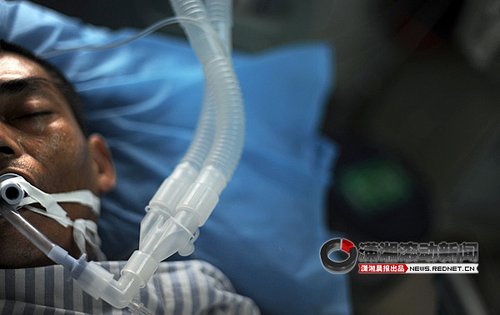 9月2日,湘潭市中心医院重症监护室,周道明嘴里插满了呼吸导管,医生说不马上手术他会有生命危险。图/杨抒怀
