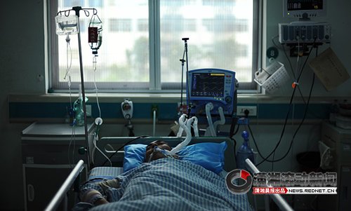 周道明正躺在湘潭市中心医院的重症监护室,靠呼吸机和点滴维持生命。 图/ 杨抒怀