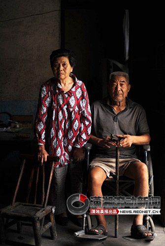 家门口,73岁的老父亲坐在轮椅上,抠着小腿的痒处。里屋黑漆漆的,他的母亲必须拄着长凳才能挪动身体。周道明的床上,是没有被套的棉絮,以及一包价值1.8元的芙蓉烟。蚊香还剩半盘未燃尽。